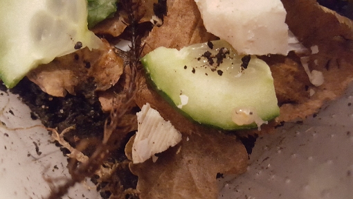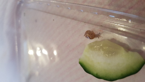Haltungsparameter: Temperatur tagsüber ca 23 °, nachts ca 21°, Luftfeuchtigkeit 80-90 %, Boden aufgekalkt, Sepia dauerhaft vorhanden, Futter: Gurke, Salat, Möhrenraspeln, Laub, heute einen Gammarus.