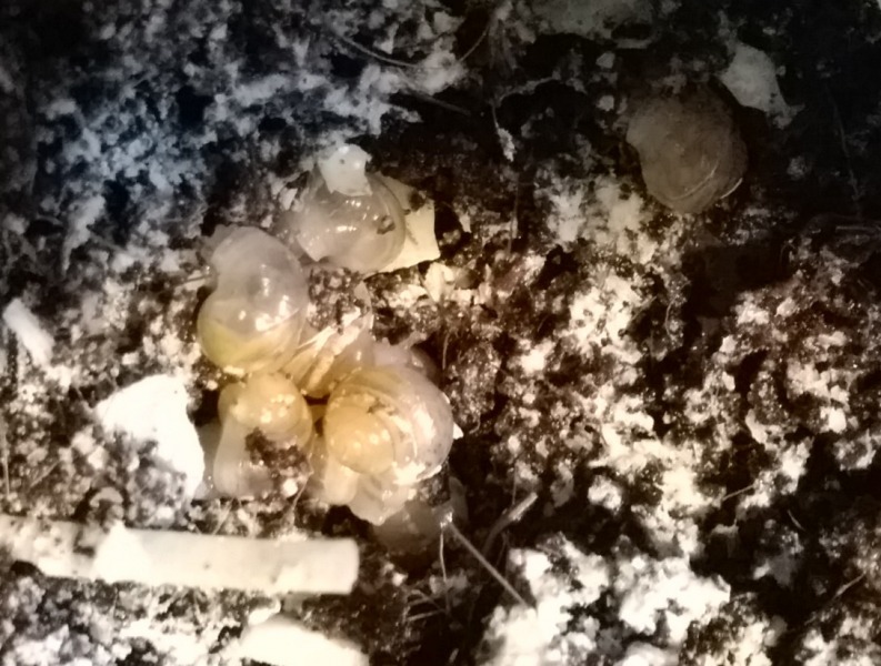 Habe nun doch das zweite Gelege mit in die Faunabox getan. Unterm Futternapf war's in meinen Augen doch ungünstig, da die Großen ständig buddelten und somit die Kleinen kaum in Ruhe gelassen wurden. Entweder roch es zu sehr nach Eiweiß und Kalk, oder ...ob sie wissen das da Babies sind und nachschauen wollen. Hm, können sie mir leider nicht sagen.