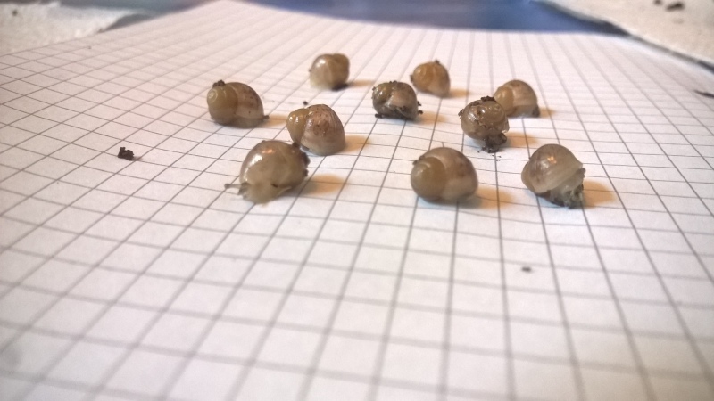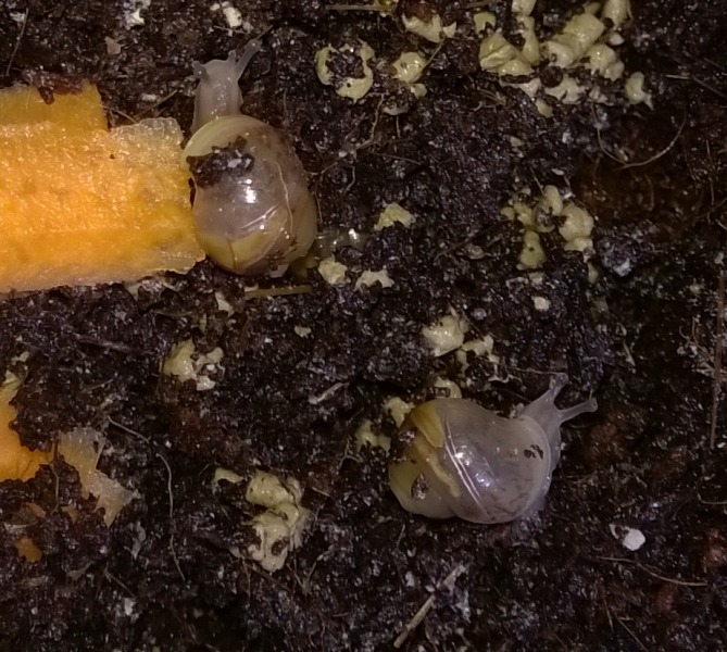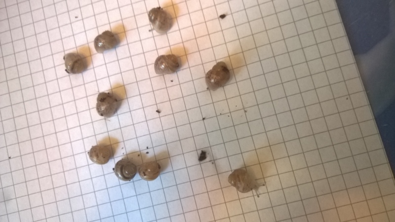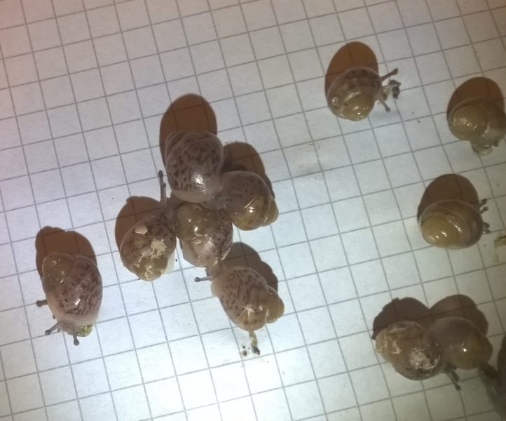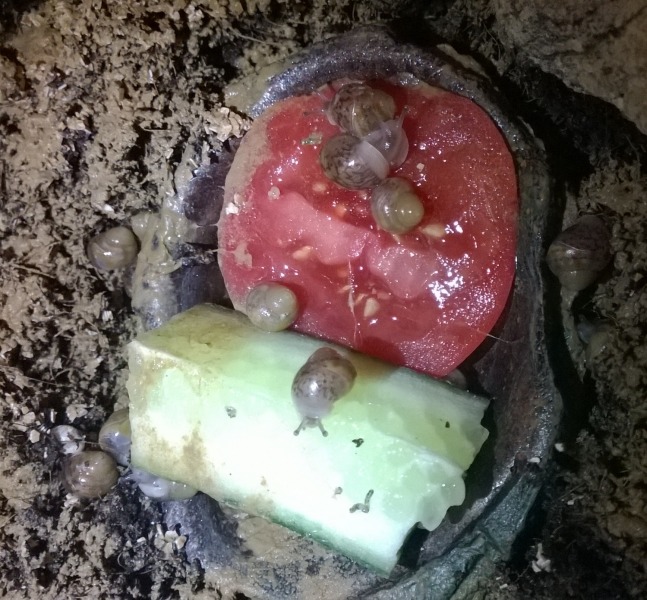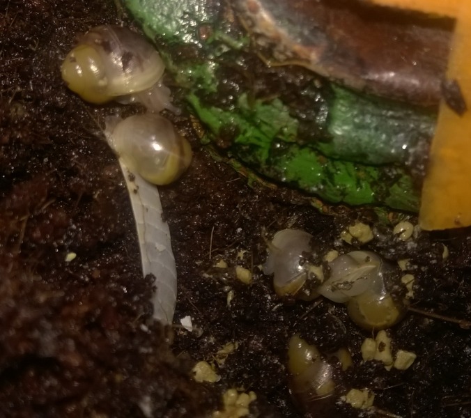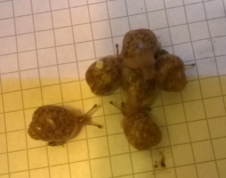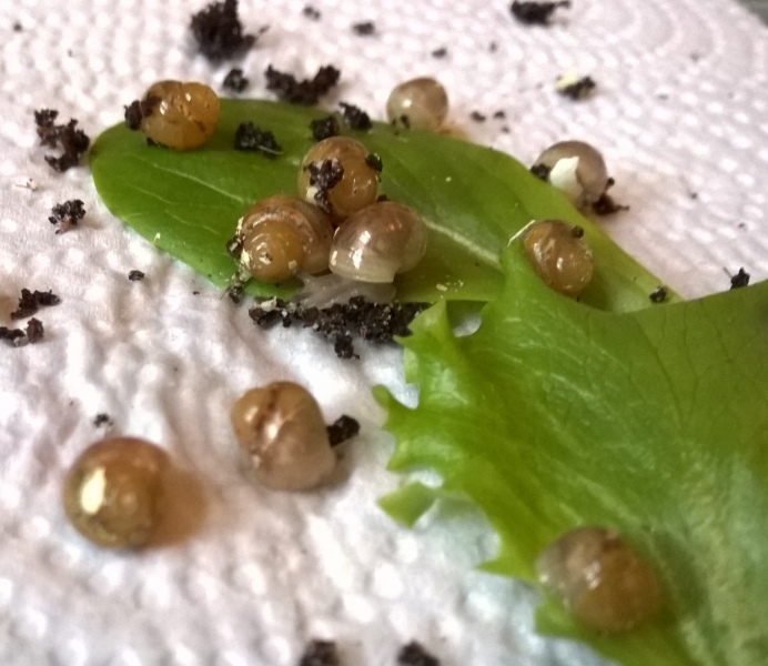 Jedenfalls wachsen sie prima. Hatte ihnen eine Kuhle aus Eierschalenresten und Heilerde gebaut und sie mit einem großen Salatblatt "zugedeckt". Der Salat war heute aufgefuttert. Da habe ich sie fürs Fotoshooting und Kacki entfernen rausgeholt.