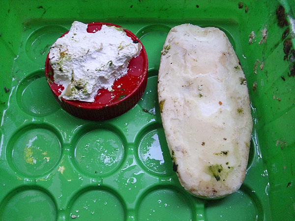 Sepiaschalen sind schön luftig-locker, bei meinem Versuch entstand ein massiver Kalkblock. Meine grosse Sorge war, ob den Schnecken das Raspeln an der lockeren Sepia ("Baiser") besonders gefällt und sie deshalb meine Kochkünste verschmähen würden. Deshalb hier ein Vorher/Nachher Vergleich: