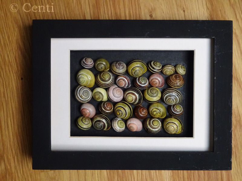 Der Witz an denen ist, dass zwischen Glas und Rückwand noch eine Holzleiste eingefügt ist, so dass man dreidimensionale Objekte einrahmen kann. Eben z.B. Schneckenhäuschen.
