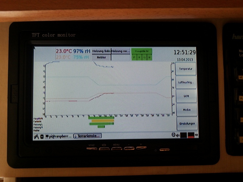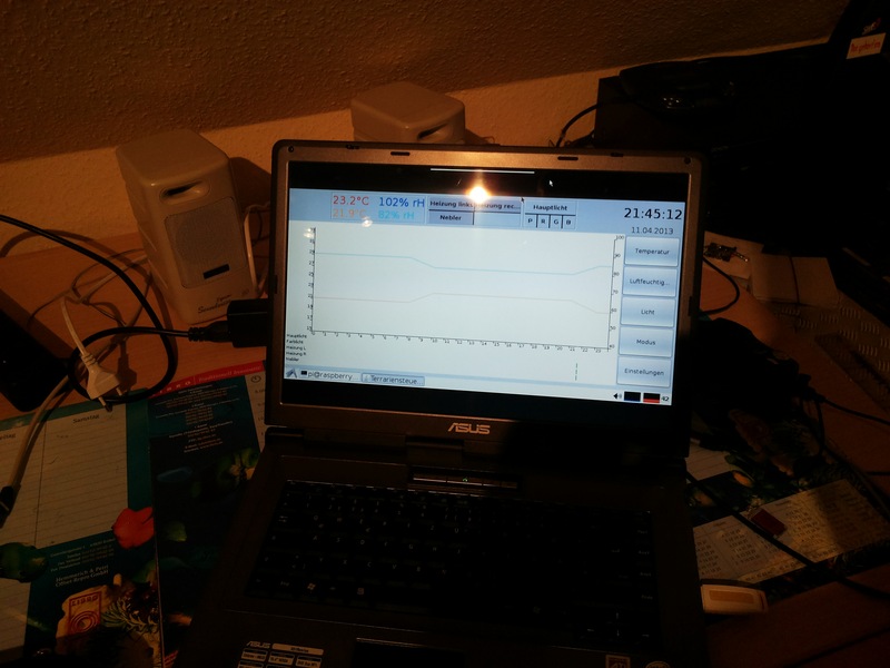Die Simulation von Sonnenauf- und -untergängen habe ich jetzt auch fertig eingebaut, das ganze befindet sich aber noch in der Testphase. Momentan steht die Kühlung auf dem Programm, die zwar schon programmiert ist, für die aber noch keine Steckdose im Terrarienschrank ist. Da muss ich aber nur zwei Kabel anschließen.