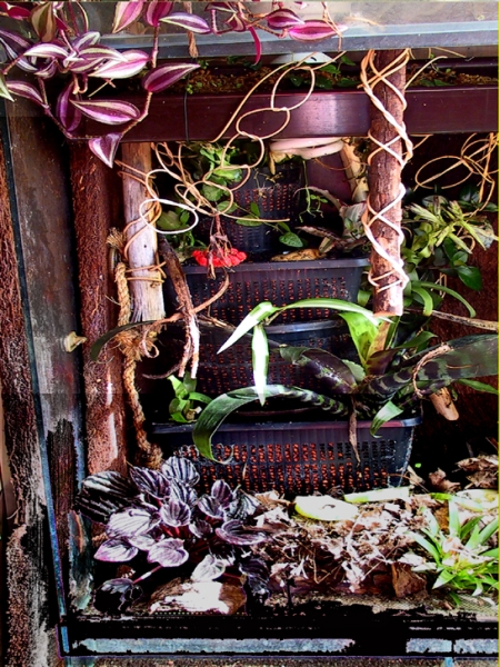 Sinn der Übung: Seramis für die Luftfeuchtigkeit, Untersetzer, damit überschüssiges Wasser nicht im Boden verschwindet und Schlamm produziert. Zugleich habe ich mehrere kleine, flache Teiche für die Tiere und die Luftfeuchtigkeit.