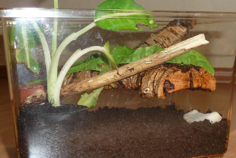 ich habe meine Archachatina marginata egregia in einem relativ hohen Becken untergebracht (mit extra vielen Kunstpflanzen mit dicken Blättern, um Stürze zu vermeiden und keinen harten Einrichtungsgegenständen).