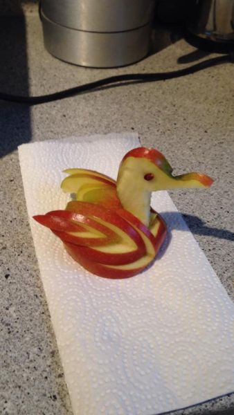 Jetzt kann er als Deko fungieren (für so ungefähr drei Minuten, bis meine Dicken ihn auseinander genommen haben Ich mach mal den Anfang mit meinem Apfel-Schwan-Futter. Hoffentlich gefällt euch die Idee