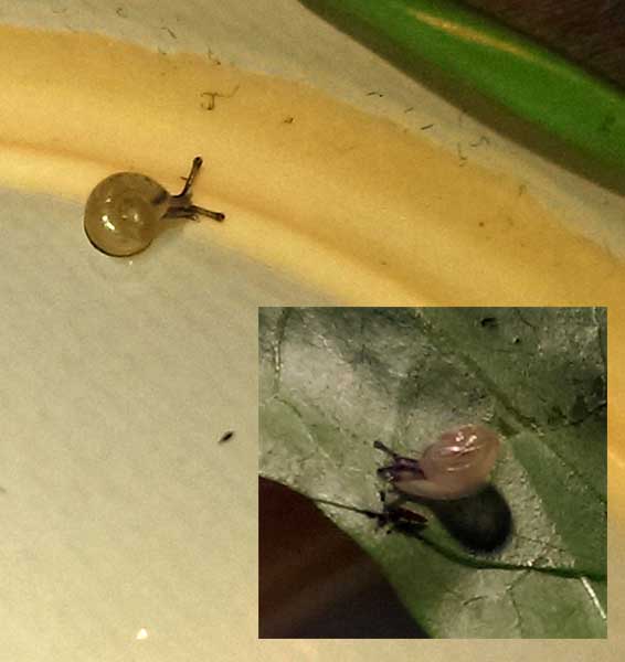 Ich habe vor ein paar Tagen mit meiner Freundin nichtsahnend eine Schale Johannisbeeren gekauft. Ein paar Trauben standen in einer Schale den Abend über auf dem Schreibtisch und ich habe aus dem Augenwinkel heraus einen kleinen Punkt am Aussenrand der Schale wahrgenommen. Erst dachte ich es wäre nur ein Johannisbeer-Kern, hab es dann aber glücklicherweise genauer betrachtet und es stellte sich als winzigkleine Schnecke heraus! Gerade mal einen Milimeter groß, kleiner noch als ein Johannisbeer-Kern. Sie hat zwei klar erkennbare Stielaugen und ein fast komplett durchsichtiges Häuschen.