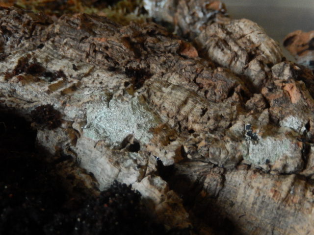 Ich denke, ich habe zu lange gewartet, bis ich die Liane rausgenommen habe. Ich dachte nämlich, ich lass die Asseln mal werken, als ich den ersten blauen Fleck daran sah - vor 3 Tagen glaube ich - vielleicht hängt das auch nicht damit zusammen, aber heute sah es auf der rechten Terrariumseite (dort ist die dünklere, kühlere Seite, also habe ich sie mit recht vielen Versteckmöglichkeiten versehen) so aus:
