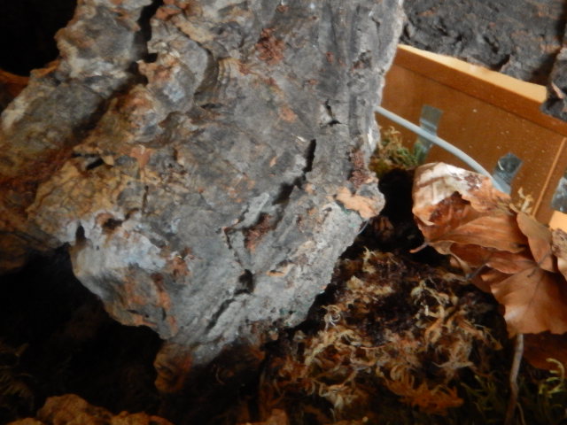 Jetzt ist das Terra recht leer, nur eine große Moorwurzel und obige Korkplatte sowie eine noch größere Korkplatte, die auf der linken Seite an die Rückwand gelehnt ist, sind drin. Etwas Laub habe ich noch übrig, damit mache ich rechts einen Laubhaufen, zum Verstecken.