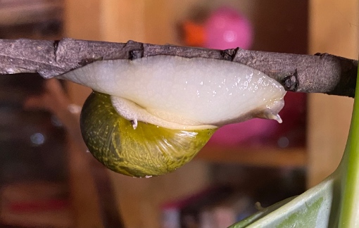riesenbabygrunz christel: gedrungener fuß, fühler auf hallbmast, mantel mit weissen einsprenkelungen; etwas später süsskartoffel-session mit langen fühlern;)