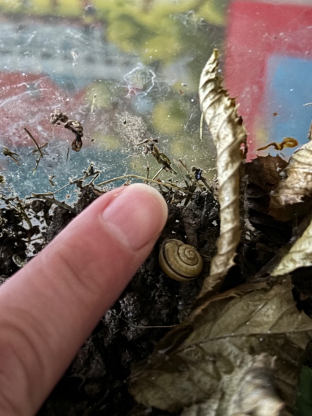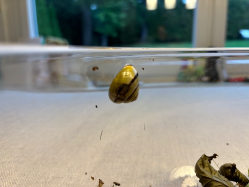Seit einigen Wochen lebt bei uns eine Schnecke. Wir haben sie auf der Treppe zum Hausaufgang gefunden. Es fehlte ein größeres Stück vom Häuschen. Da ist das innere Kind wieder zum Vorschein gekommen und ich konnte sie so nicht sitzen lassen. Die Schnecke ist fit. Aber es hat sich nur eine Art weiße Schicht an der angeknacksten Stelle gebildet. Bisher hatte ich mich noch nicht „getraut“ sie wieder ins Freie zu setzen, nachdem sie sich beim ersten „Auswilderungsversuch“ nicht von der Stelle bewegt hat (mehrere Tage nur von geöffneten Behälter zum „Deckel“ und wieder zurück) und ich dann bei den heißen Temperaturen doch Sorge hatte, das diese dünne weiße Schicht nicht zum Überleben reicht.