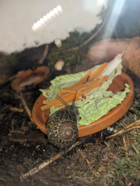 Da sie, liebevoll Schneckbert getauft, ein kaputtes Gehäuse hatte, habe ich mich hier informiert, ihr ein Terrarium eingerichtet und sie fleißig ihr Haus reparieren lassen. Alle Schäden sind jetzt abgeheilt und sie ist doppelt so groß und so langsam frage ich mich, was der nächste Schritt ist.