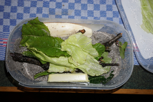 Außerdem habe ich Stöcke, Salatblätter, Löwenzahnblätter ein Möhrenstück etc. mit rein gelegt.