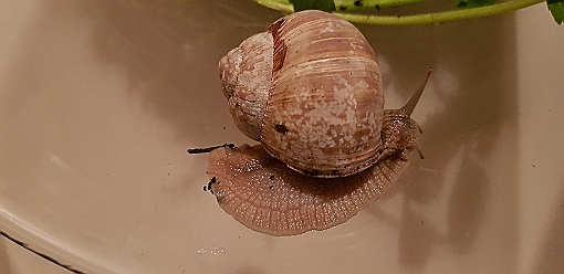 Gestern lag der "Deckel" im Moos, Schneckli ganz im Gehäuse eingemummelt. Daraufhin einen halben Gemüsestand (Tomaten, verschiedene Salate, Kräuter etc.) ins Glas gegeben.