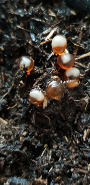 ich habe jetzt auch ein rotes Ei in meinem Terra entdeckt. Ich habe davon ein Foto gemacht und danach habe ich ganz leicht auf das Ei raufgedrückt. Und plötzlich kam ein kleiner Wurm aus dem Ei. Ich habe schnell gehandelt und das Ei auf den Rasen geworfen, was sicherlich ein Fehler war.