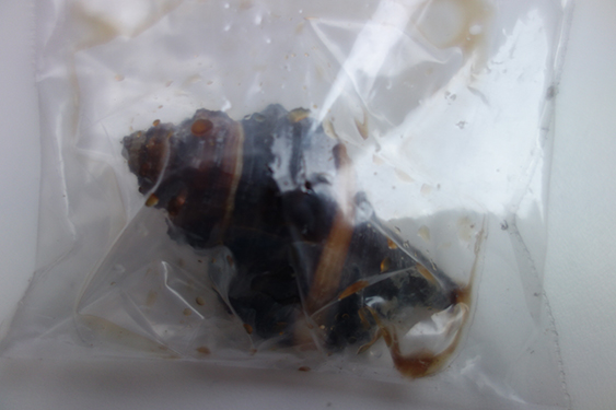 Sie sieht sehr hübsch aus, riecht aber unangenehm. Deswegen habe ich das (zweite) Plastiktütchen, in dem sich die Schnecke befindet, noch nicht geöffnet. Ich weiß nicht, ob sie noch lebendig ist und ich weiß auch nicht, ob sie eine Süß- oder Salzwasserschnecke ist. Definitiv ist es keine leere Hülle.