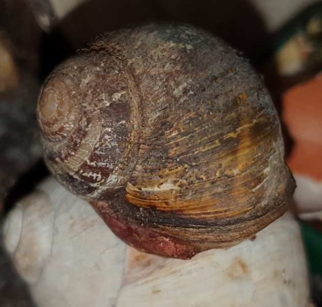 Wenn die Schnecke geweckt wurde, sich aber wieder zum Schlafen zurückgezogen hat, sind an der Öffnung jetzt wahrscheinlich einige pergamentartige Häutchen zu sehen, die können auch dunkler erscheinen.