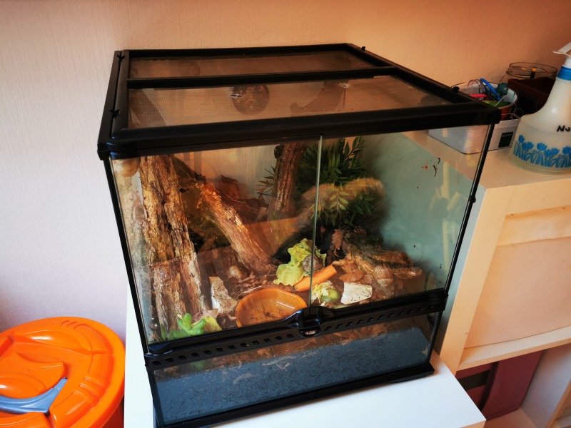 Das neue Zuhause ist ein 45er Exo Terra Würfel mit Kokoserde. Die Belüftung ist gut, Temperatur z. Zt. bei 23 Grad, Luftfeuchtigkeit liegt zwischen 50 u. 85 %. Ich habe ausprobiert ob sie es lieber etwas feuchter o trockener haben wollen. Ansonsten das was sie schon kennen im Terra, Kletteräste, Buchenlaub, Badeschale.