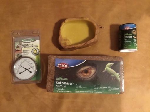 Du bräuchtest noch eine Wasserschale, die aber nicht sonderlich tief sein darf, am besten einen Blumentopfuntersetzer (Kunststoff).