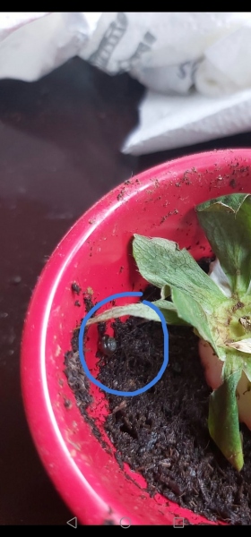 Ich habe in einen Becher von einem McDonalds-Eis feuchte Erde reingetan, den Deckel zerschnitten und Fliegenschutzgitter draufgeklebt und ihr ein Stück Erdbeere reingelegt.