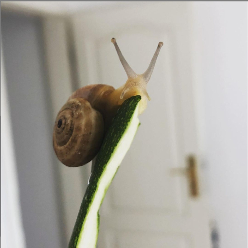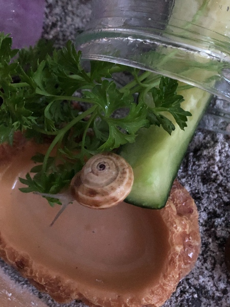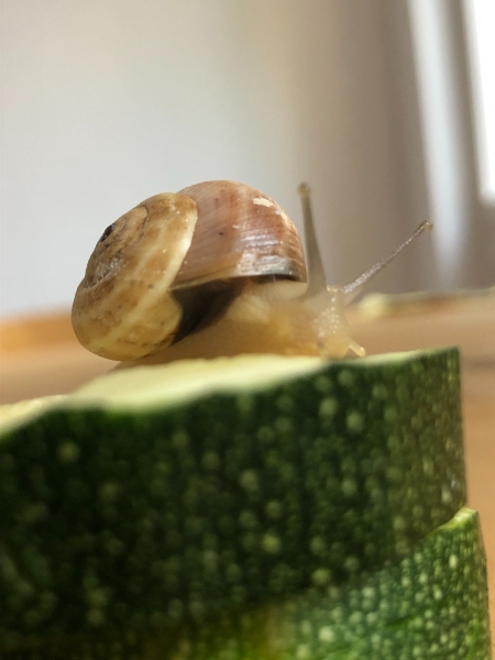 Momentan lebt sie in einem Einmachglas (Deckel natürlich nicht verschlossen, und regelmäßig befeuchtet) Ich füttere sie mit Gurkenscheiben. Aber das soll sich so bald wie möglich verbessern.