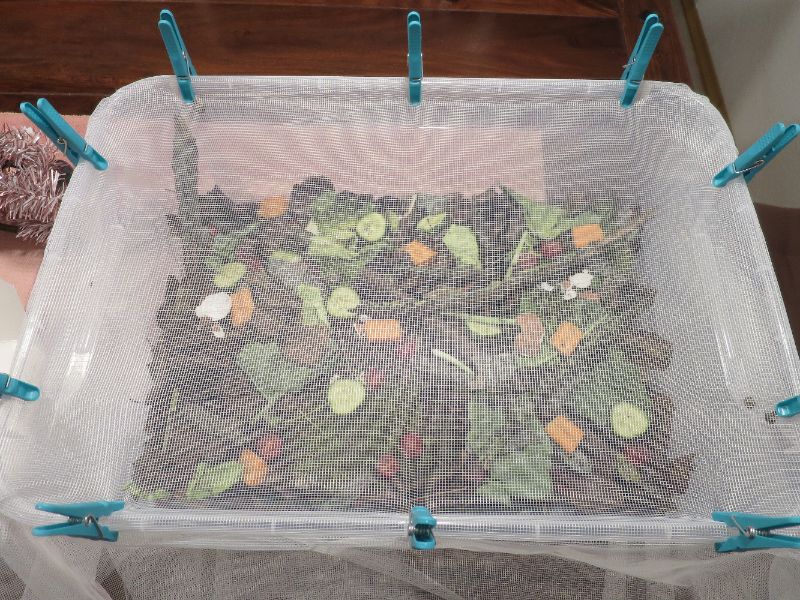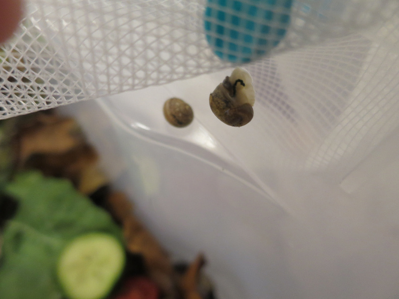 Die 9 Schnecken sind aktuell in ner laenglichen Plastikbox die ich mit Laub gefuellt hab, war mir nicht sicher ob ich Erde aus dem Garten reintun soll. Ansonsten hab ich 2 Stoecke sowie Gurken, Tomaten und Kohlrabiblaetter reingelegt. Hab auch paar Eierschalenreste reingetan auch wenn sie evtl. nichts damit anfangen koennen, hatte jetzt erstmal nicht anderes. Abgedeckt hab ich die box mit Fliegengitterstoff und dieses drumherum mit Waescheklammern stramm gezogen und befestigt. Die Schnecken scheinen darauf kriechen zu koennen, hoffe nur die versuche es nicht zu essen. Damit sollte auch genug Sauerstoff in der Box sein.