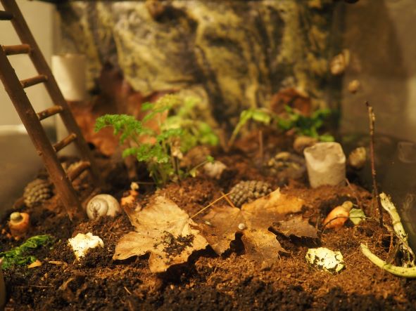Für's Erste will ich sie gerne in Ruhe lassen, damit sie sich erholt. Aber sie ist nicht alleine. Sie lebt mit ein paar Gartenbänderschnecken, drei Gefleckten Weinbergschnecken & einem Halbwüchsigen (von dem ich nicht sagen kann, was es einmal wird^^), zusammen. Welche Größe für das Terrarium würdet ihr hier für angebracht halten? Meines misst 45x45x45.