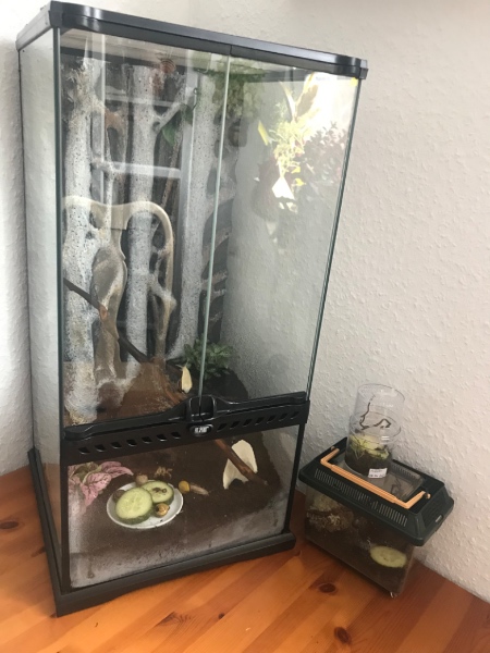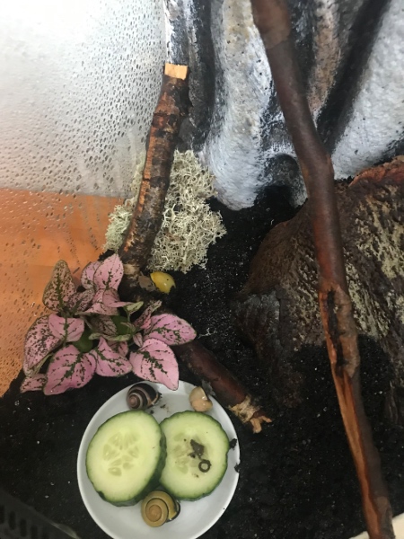 Im Moment habe ich in den Faunaboxen Erde, Moos, etwas Flechte, ein Holz zum Klettern und lebenden Löwenzahn (habe einfach Samen in die Erde gemischt). Dazu natürlich für die schlimmen Fälle Sepiaschale (teils rausgekratzt und in die Erde gemischt, teils am Stück). Füttern tue ich Gurke, Salat und Co.