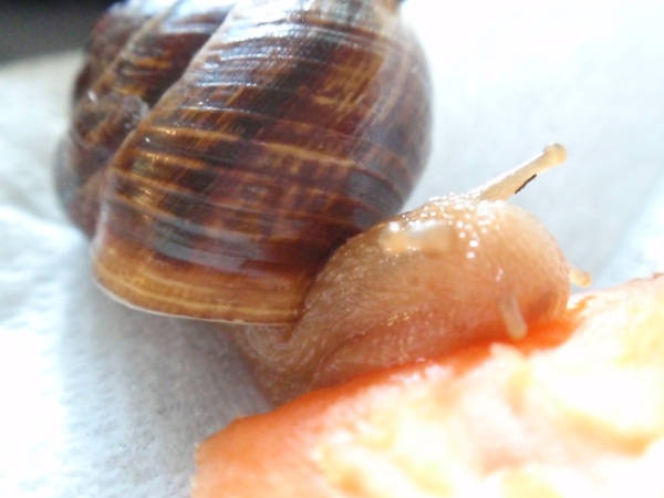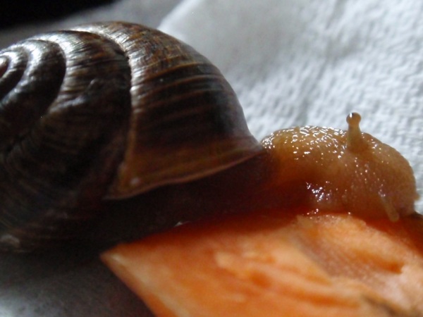 Und jetzt eine relativ gute Nachricht: Die Schnecke von oben lebt noch. Ich habe sie mit einem feuchten Tuch zugedeckt. Als sie herausgekommen ist hat man direkt gesehen wie sie sich geblagt hat :( . Leider hat sie sich gleich wieder eingezogen. Nach 10 Minuten kam sie nochmal heraus, aber nur für eine Minute. Danach wieder rein. Jetzt konnte man zum Glück das Atemloch sehen. Als ich das nächste mal nach ihr schaute atmete sie nichtmehr :o Auserdem war dasGehäuse voll Flüssigkeit :| Ich habe die Flüssigkeit vorsichtig mit einem Stück Küchenrolle aufgesaugt und sie dan vorsichtig angestubst. Ich weiß nicht warum, aber irgendwann hat sie wieder angefangen zu atmen und sich langsam auszurollen. Immer einatmen- ein Stück nach vorne- Pause. So hat sie es schließlich bis nach draußen geschafft.Dort war schon ein Stück Karotte für sie. Jetzt frisst sie gerade, allerdings scheint ihr Körper zu schwach zu sein um das Haus zu tragen :cry: