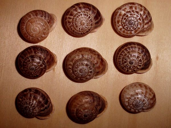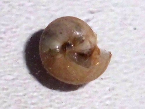 Die "leeren" Schneckenhäuser lagen unter einer Oleander-Hecke in der Nähe des Strandes (Mittelmeer). Die kleine Schnecke hat einen Hausdurchmesser von ungefähr 5 mm.