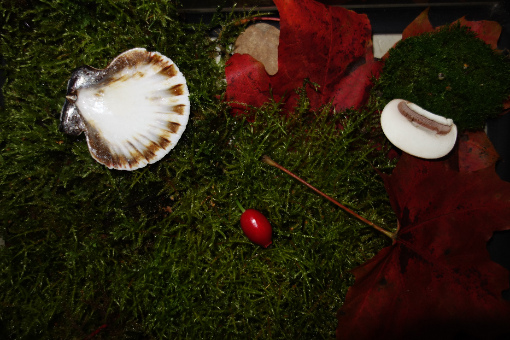 Ich hab jetzt fürs Erste feuchtes Moos und einige Blätter ins Aqua gelegt. In der umgedrehten Muschel ist etwas Wasser und ich hab ein Stück Pilz reingetan.