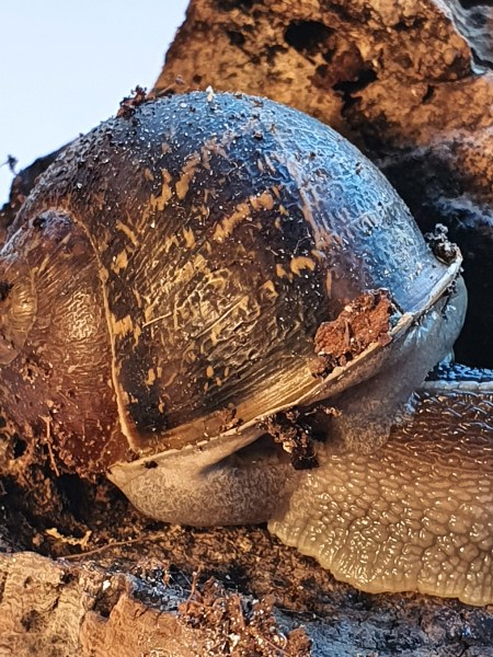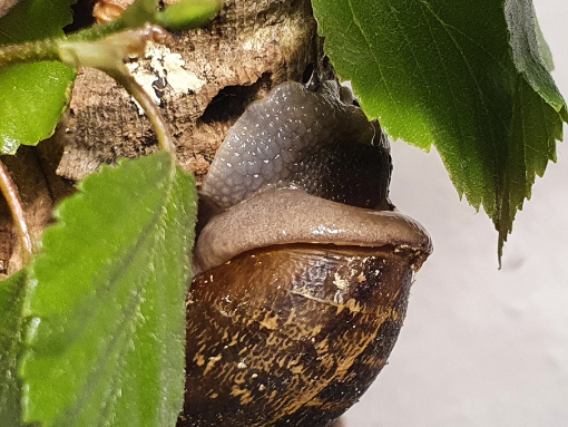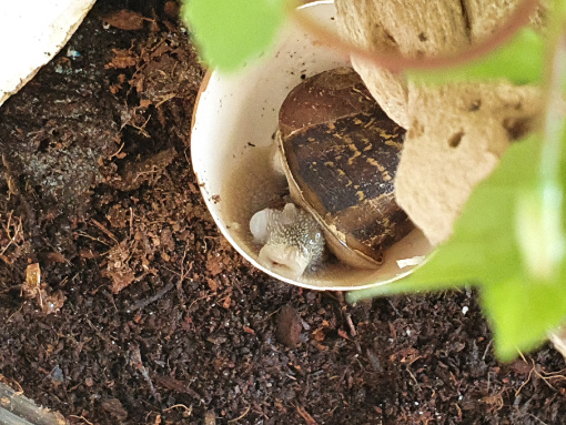 Seit Ende Oktober lebt eine Cornu aspersum bei uns, zugezogen über einen Hortensienzweig. Zunächst sehr klein ist sie bis zum Frühjahr gut gewachsen, einzig ihr Speiseplan war sehr begrenzt: sie aß nur Salatgurke ( va die Kerne ), seltener Salat und sehr gerne Kohlrabiblätter. sonst nichts. Da ihr Gehäuse so weich war, habe ich von Zeit zu Zeit eine Eierschale dazu gelegt .