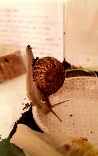 am 11.04.20 fanden wir diese hübsche Schnecke auf unserem Balkon, was sehr verwunderlich ist, da wir mitten in der Großstadt an einer vielbefahrenen Kreuzung leben. Bislang haben wir hier in der Gegend noch keine Schnecke gesehen. Da dieser Ort für die Schnecke kein guter Lebensraum ist und es ringsherum von Vögeln wimmelt (!), nahmen wir sie mit rein und nannten sie Fine / Finchen.