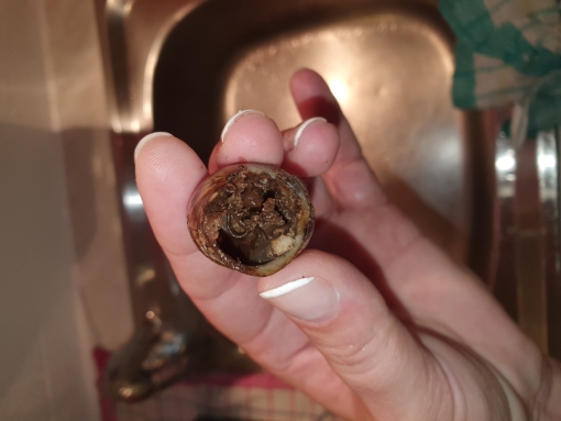 Den Stein bitte rausnehmen, Schnecke könnte sich beim abstürzen verletzen/ Miesmuscheln gut wässern, damit kein Salz mehr anhaftet.