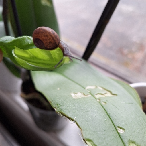 Wir leben in Norwegen und im April kam diese kleine Schnecke auf einer Orchidee zu uns: