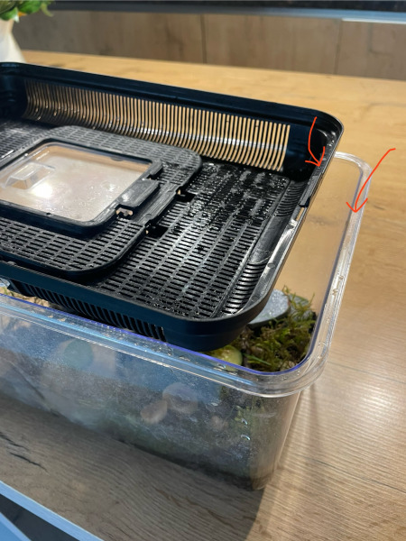 Vor 2 Tagen passierte dann das Unfassbare. Wir fanden die kleine Schnecke am Deckelrand des Terrariums. Ein kleiner (vorderer) Teil der Schencke schien eingeklemmt zwischen Deckelaufsatz und dem Behälter des Terrariums.