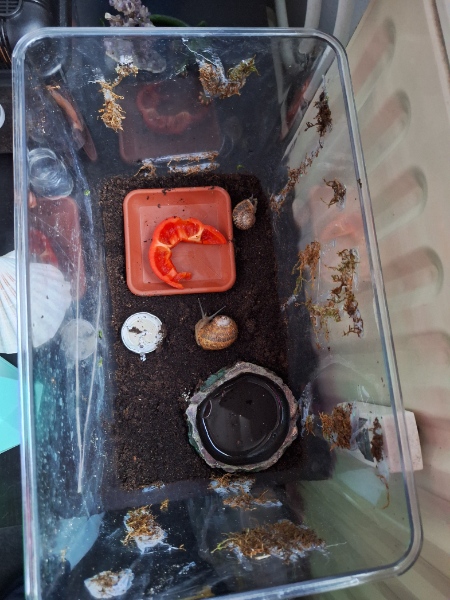 Keine Verstecke, keine Äste nichts...bitte das Badegefäss gegen einen Plastikuntersetzer tauschen. Nochmal...lass sie zusammen und lass sie ihr Leben leben, und zwar so artgerecht wie möglich, in einem schönen abwechslungsreichen Terrarium, Beispiele findest Du genügend in der Galerie. Sie zu trennen ist schlimm für die Schnecken da sie sich paaren wollen, also lass sie sich auch paaren. Es kann immer mal vorkommen, auch in der Natur das eine Schnecke nach der Paarung bzw Eiablage stirbt, aber lass ihnen ihr Leben und ihren Zyklus wie sie es brauchen und vor allem NICHT TRENNEN !!! lg Fuzzi