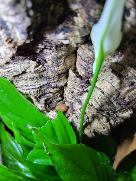 Nun haben wir letzte Woche noch einmal einen Versuch mit orangen Porcellio laevis gestartet, weil diese wohl mit höherer Luftfeuchtigkeit besser klar kommen als die Kubaner. Leider ist auch von diesen Asseln so gut wie nie etwas zu sehen im Terrarium. Wir haben zwar etliche bei der Eiersuche am Wochenende in den Korkteilen sitzen sehen aber sie bewegen sich von dort nicht weg.