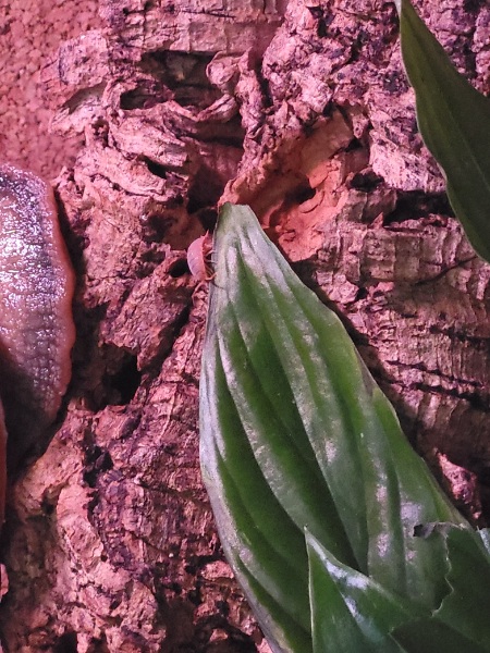 Die Temperatur im Terrarium liegt tagsüber bei 24 - 27 Grad mit Steigerung am Morgen und Temperaturabfall am Abend. Nachts liegt sie bei 22,5 - 23,5 Grad. Die Luftfeuchtigkeit liegt bei 85 - 90 %.