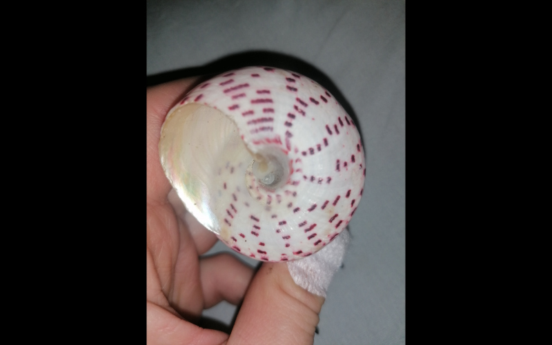 Wir haben einWasser Schnecken Gehäuse zuhause, dieses ist weiß mit rosa strichen siehe Foto.