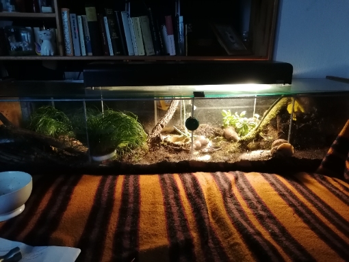 Die Erde im Terra ist aufgekalkt und es sind Sepiastücke vorhanden. Zudem habe ich Basilikum drin und, zur Gemütlichkeit, Katzengras.