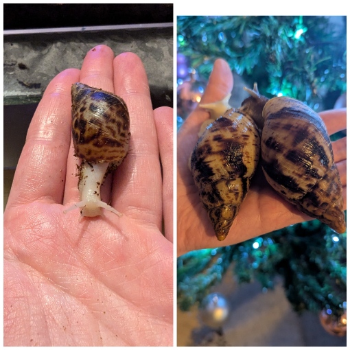 mein Sorgenkind ist meine Albino-Reticulata. Pups kam zu mir Mitte September mit 3cm. Dem Haus konnte man ansehen, dass die Haltung bis dato nicht ganz so super war. So hatten wir anfangs auch Schwierigkeiten. Pups wollte die ersten 4 Wochen nicht wachsen. Nichtmal ein winziger Wachstumsrand war zu sehen. Mit den richtigen Parametern und viel Pflege begann sie sich sichtlich zu erholen. Seit Ende Okt. hat sie aufgeholt. Pups bevorzugt es am Deckel zu hängen. Tagsüber sieht man sie selten bis gar nicht. Heute sehr früh morgens war sie wie gewohnt wach. Ich beobachtete sie einige Minuten, wie die Anderen auch beim Kaffee. Morgens um 5 sind meist alle Wach im Terra. Aber schon dort empfand ich ihr Verhalten seltsam. Sie hing über der Futterschale auf dem Weg nach oben. Für gewöhnlich schleimt sie straight nach oben und sucht sich ihren Platz. Heute sah es aus, als käme sie verzweifelt nicht nach oben. Gedreht, gewendet und schleimte um sich und die Stelle im Kreis. Gut, dachte ich. Helfen wir mal. Ich habe sie dann erstmal auf den Grund in einem Pflanzenversteck abgesetzt. Als ich von der Arbeit kam, saß Pups immer noch dort. Wach. Unruhig. Ich vermute, sie war nicht einmal in ihrem Haus/hat geschlafen. Also habe ich mir das Spektakel nochmal einige Zeit angesehen, bevor ich sie herausholte. Ich fand keine Schäden oder Auffälligkeiten äußerlich. Sauber war sie auch, ich kontrollierte nach Milben. Ich setzte sie aufs Futter, wo sie dann zur Scheibe schleimte und das selbe Spiel von heute morgen ging von vorn los. Jetzt, fast 3Std später hat es nicht aufgehört. Sie versucht hochzuschleimen, schafft oder kann es aber nicht. Also habe ich sie nochmal versetzt in ein kleines Versteck, bodennah, nicht hoch und wo sie trotzdem hängen kann.