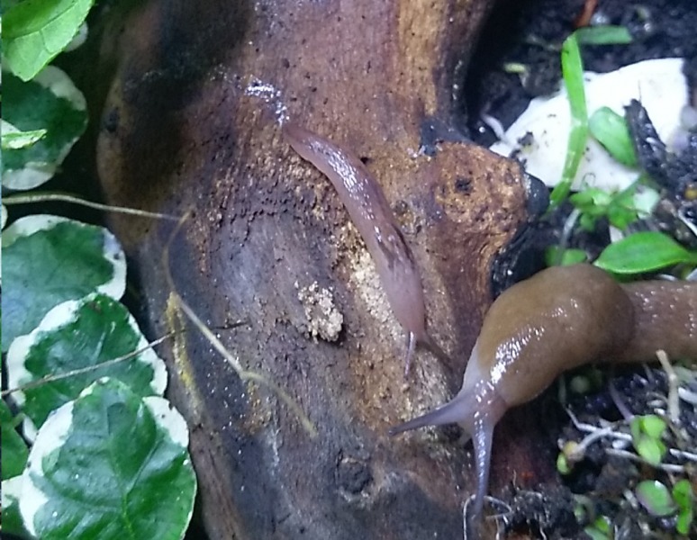 Habe letztes Jahr im frühen Sommer in einem Gartencenter ein paar Pflanzen gekauft und an einem Blumentopf hing eine kleine Nacktschnecke. Ich wusste nicht, welche Art das ist und ob sie überleben könnte wenn ich sie mit den neu gekauften Pflanzen einfach draußen lasse. Also habe ich sie in ein Terrarium gesetzt und dann sicher ein halbes Jahr nicht mehr wieder gesehen. und genauso mysteriös wie sie verschwand, tauchte sie nun vor kurzem wieder auf, riesig groß und hier und da wuseln einige Babies und Jungtiere herum.