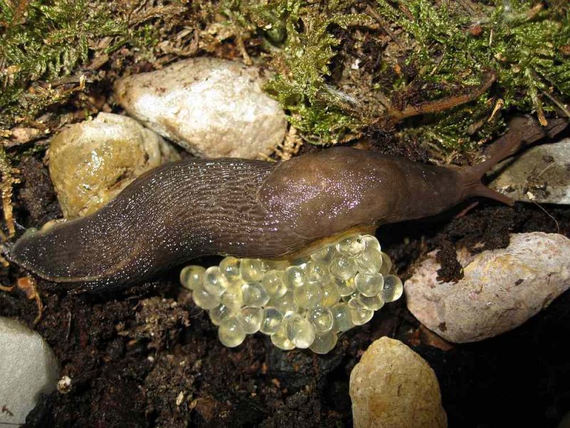 vor ein paar Wochen bin ich nachts in meiner Siedlung beinahe auf eine Nacktschnecke getreten. Ich nahm sie hoch um sie in den nächsten Garten zu setzen und fühlte, die dass ich die nicht kannte. Also durfte sie mich nach Hause begleiten und dort ein schönes Eigenheim beziehen. Bis heute rätsele ich, was es für eine Schnecke sein könnte. Es passt nichts, was ich kenne. Da sie bereits Eier gelegt hat, ist sie adult. Die Größe beträgt 8,5 cm. Limax maximus und cinereoniger scheiden meiner Meinung nach aus, für einen Milax oder Tandonia ist der Kiel zu kurz. Ich würde das Tier gerne Richtung Limacus zuordnen, aber da gibt es scheinbar nichts in schwarz. Auffällig ist noch, dass er alles Grüne wie Salat oder Blätter ablehnt, dafür verrückt ist nach Banane und Pilzen. Gestern habe ich Wasser in sein Becken gesprüht und aus Versehen hat er etwas abbekommen. Vor Schreck hat er sich aufgerichtet und die Seitenlappen seines Mantelschildes für einen Moment seitlich gestellt, wie eine Agame. Das sah irre aus, hab ich noch nie gesehen. Die Eier sind klarsichtig und gelblich, aber bei weitem nicht so groß wie von Limacus maculatus. Den gibt es hier.
