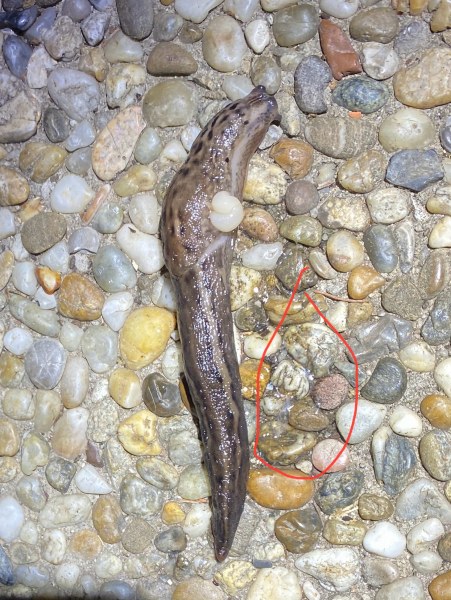war eben nochmal kurz draussen und sah den tigerschnegel mit einem weissen ding, das sah aus wie gedärme nur eben in weiss. das quoll glaube ich aus dem atemloch (?) heraus. rechts hinten ein weisslicher schleimfleck. und ca. 30cm entfernt ein richtig grosser weisslicher schleimfleck auch am boden. zw. beiden schleimflecken aber keine spur.