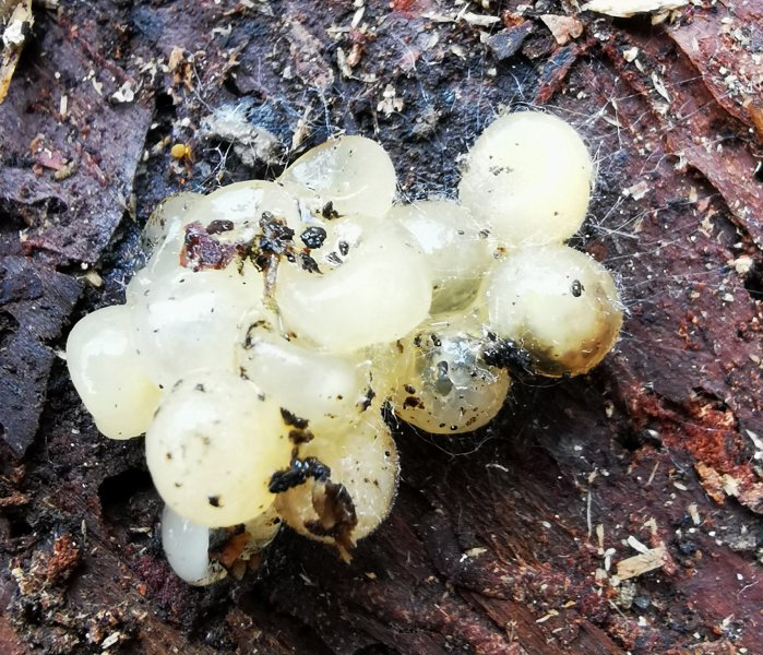 Ich kenne mich aber mit Eiern wirklich nicht aus und kann da nicht wirklich weiterhelfen. Für mich sehen sie aber eher wie Schneckeneier aus? Also, ich glaube sogar, Gehäuse zu erkennen? Kann aber täuschen.