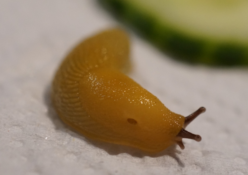 eine war noch kleiner (so 1 cm volle Kriechlänge), aber die ist wohl eingegangen und den Asseln zum Opfer gefallen (...und sie ward nie mehr g'sehn!). Ich habe wohl auch 2 kleine, wohl umgangssprachlich "Tellerschnecken" genannt, mit eingeschleppt, die hab ich erst wahr genommen, als sie mal auf nem Stück Gurke saßen, heute ist eine an der Decke gekrochen die sind mega winzig winzig aber scheinbar ausgewachsen (Häuschen-Schnecken aber....).