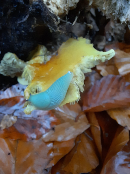 Ich wohne im Westerwald und gestern, beim Pilze suchen, sind uns diese beiden grünen (türkisfarbenen) Nackstschnecken aufgefallen.