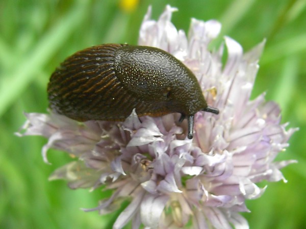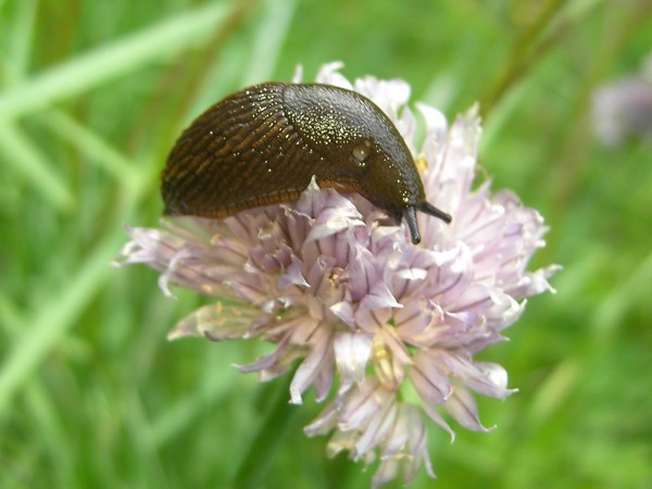 momentan sichte ich meine Fotos jahrgangsweise nach Käfern, und dabei sind mir diese beiden von Juni 2009 untergekommen. Natürlich kein Käfer sondern eine Nacktschnecke (Arion?), die sich an einer Blüte vom Schnittlauch labt. Wäre vielleicht mal einen Versuch wert, ob unsere Häuschenträger das auch mögen... Die Aufnahme entstand in einem Garten im südlichen Schleswig-Holstein.