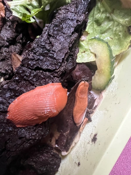 Vor ein paar Wochen habe ich eine kleine Nacktschnecke namens Schnecki im Salat gefunden und wollte sie im Winter nicht aussetzen. Wir haben ihr dann ein Terrarium gebaut. Wir haben Erde aus dem Wald geholt und dort unter einem Blatt eine Nacktschnecke gefunden, die haargenau gleich aussah, auch gleiche Größe. Da ich gelesen habe, dass man Schnecken nie alleine halten sollte dachte ich toll, dann bring ich sie Schnecki mit. Meine Login war: wenn ich Schnecki aussetze kann sie mit dem spontanen Temperaturabfall nicht umgehen und könnte sterben, während die andere Schnecke sich eher dem Terrarium anpassen könnte.