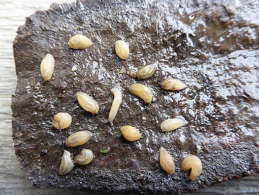 Juvenile Tiere der Roten Wegschnecke sind meist - aber nicht ausschliesslich - von weisser, hellgelblicher bis helloranger Farbe mit dunklem Kopf.